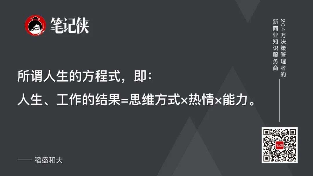 4.所谓人生的方程式,即“人生、工作的结果=思维方式×热情×能力”。