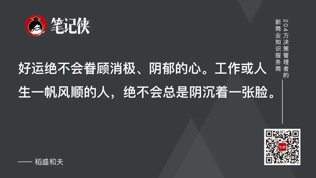 “保持积极乐观的态度”,并不仅仅是为了引领整个团队。因为好运会青睐乐观的心。好运绝不会眷顾消极、阴郁的心。工作或人生一帆风顺的人,绝不会总是阴沉着一张脸。