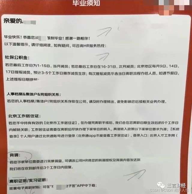 网友曝光的“毕业须知”上,公司开头加粗字体祝贺称:毕业快乐!恭喜您顺利毕业!感谢一路相伴!
