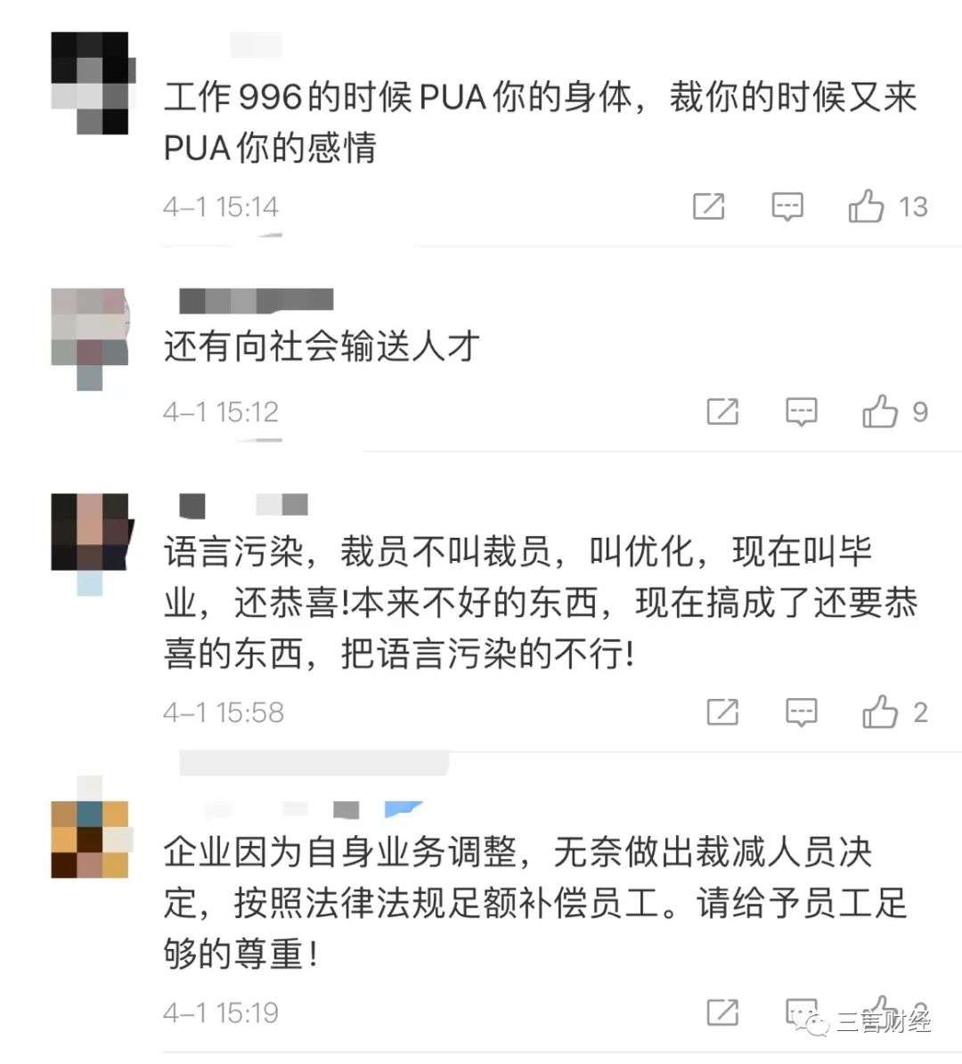 网友们均认为,用“毕业”形容裁员是对员工的不尊重,甚至是侮辱和嘲讽。