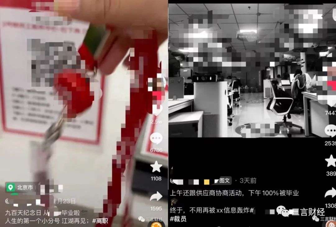 还有很多网友在短视频平台上晒出自己被裁,他们拍下办公楼、办公室,还有自己的工牌,配上伤感的音乐,并且在文案中写着自己“毕业了”。