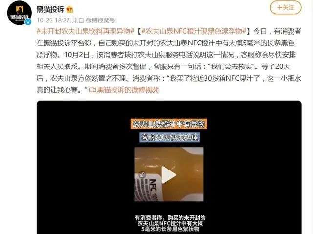 就在大家以为风浪已过时,10月22日,有媒体又报道农夫山泉NFC饮料有不明异物,再次引发争议,令一众网友拍案称奇。