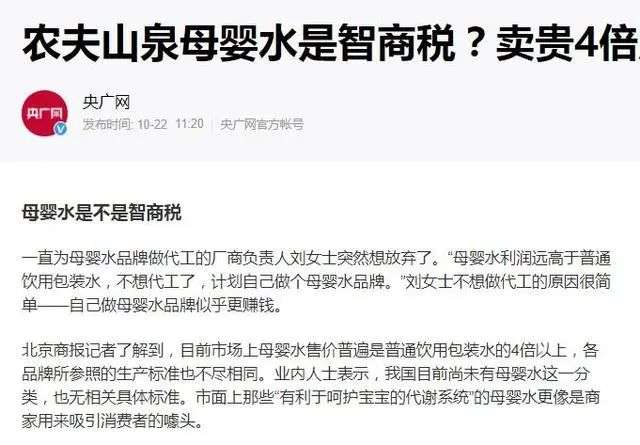 除了形形色色的负面事件外,农夫山泉还因售卖高价母婴水引发质疑,央广网甚至公开发文报道,称“更像是商家用来吸引消费者的噱头”