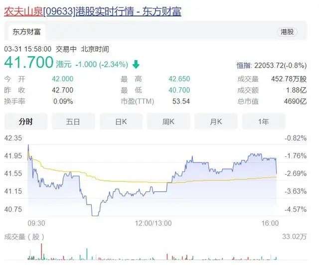 问题来了,坐拥农夫山泉和万泰生物两大吸金巨兽,为何钟睒睒的身家还暴跌了超1000亿?2021年1月8日,农夫山泉股价触及68.75港元/股的最高点,总市值一度超过7700亿港元,而2022年3月31日,农夫山泉股价仅41.700港元,总市值仅余4690亿港元,足足蒸发了超3000亿港元。