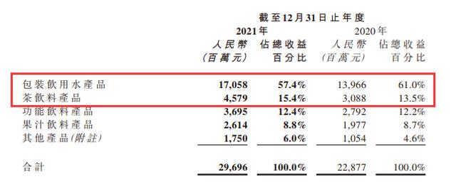 茶饮料产品2021年全年收益为45.76亿元,较2020年增长48.3%,总收益占比自2020年的13.5%提升至15.4%;