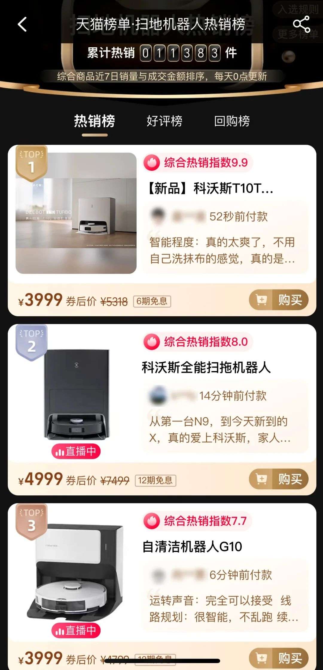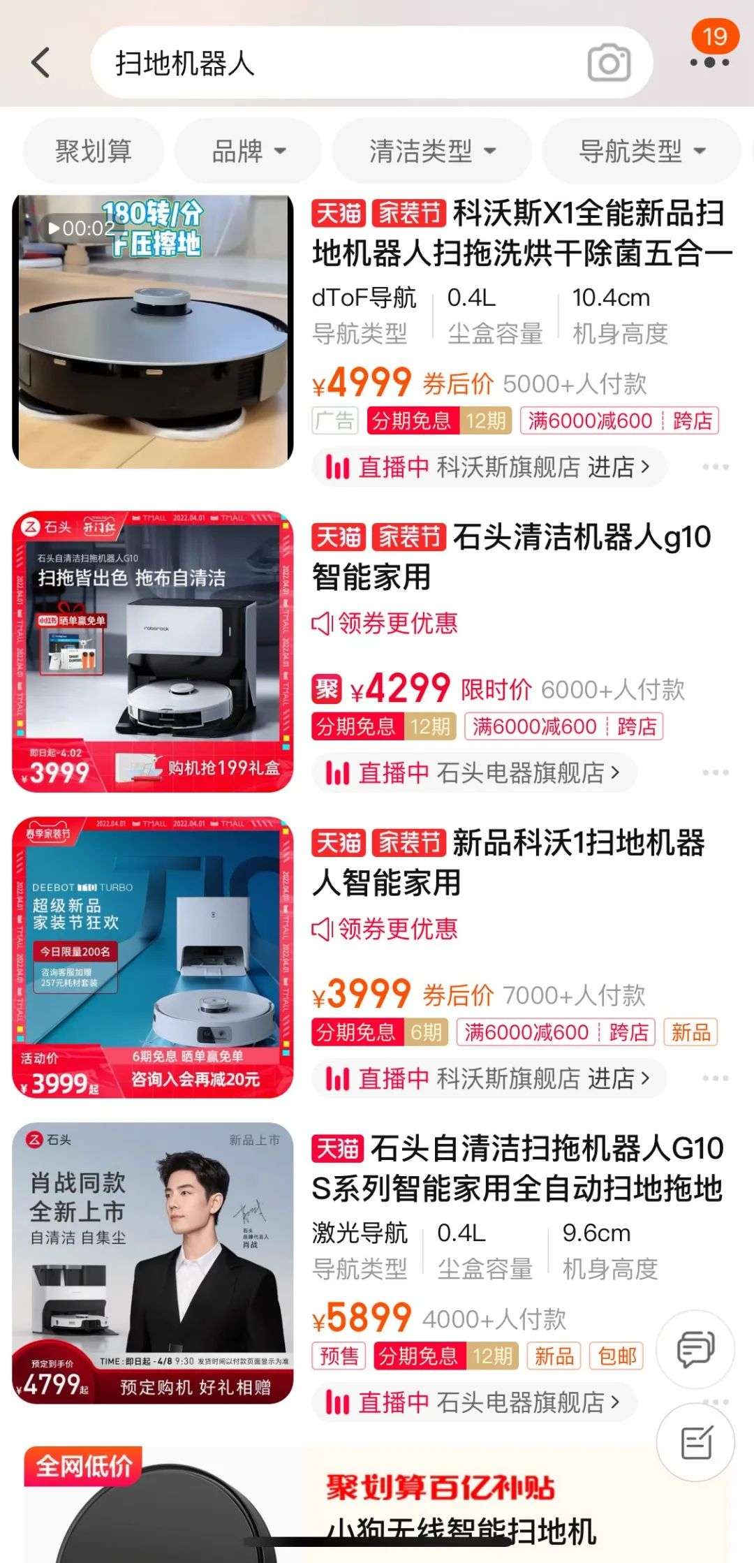 而在“天猫榜单-扫地机器人热销榜”上,前三甲分别是科沃斯和石头科技的产品,标注的券后价格均在3999元及以上。