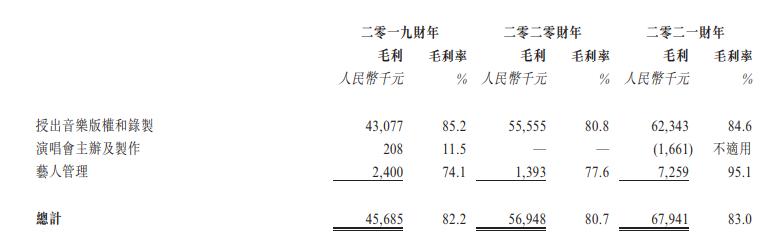 2019年至2021年,风华秋实购入的音乐作品总数分别为0件、16件、262件;自制的音乐作品总数分别为57件、36件、21件,音乐作品的总制作成本分别约为807万元、722万元及217万元,平均每件原创音乐作品的成本约为20.2万元、21.2万元及10.4万元。这三年,授出音乐版权和音乐录制业务的毛利率分别为85.2%、80.8%和84.6%。