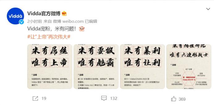 海信电视不擅线上营销的一面,在去年11月发生的Vidda电视负面舆论中体现得颇为明显。去年11月,海信子品牌Vidda在微博发布了四张争议海报,直指对手小米“屌丝,耍猴,暴利,伪性价比”。
