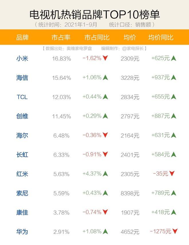 中怡康数据显示,2021年上半年,海信电视在线下市场的销量还是国内第一。但结合奥维家电罗盘,线上线下综合统计的数据,2021年前三季度,小米电视市占率为16.83%,仍略微领先于海信的15.64%。
