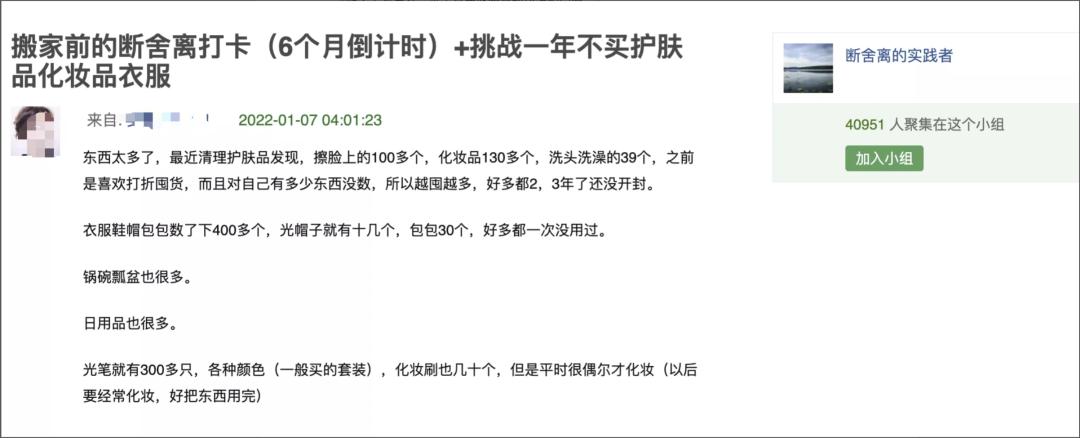 在豆瓣断舍离的实践者小组里,有网友在年初立下了,挑战一年不买护肤品化妆品衣服的帖子。