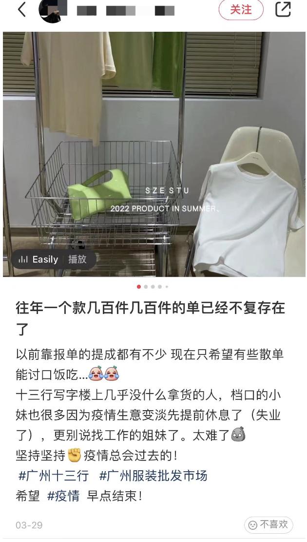 有女装店主表示,广州十三行几乎没什么拿货的人,档口的小姐妹也很多因为疫情生意变淡提前休息了,太难了。
