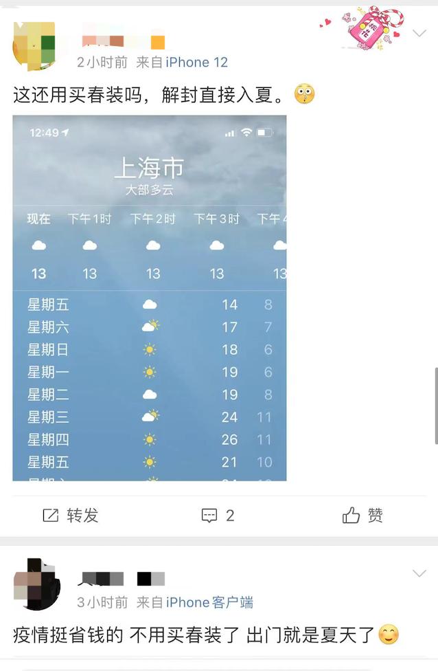 “还用买春装吗,解封直接入夏。” 家住浦东区的上海女孩Rebecca,已经在家办公12天了,3月初本来准备购置春装,因为疫情原因被隔离在家,“就算买了,也寄不到,寄到了等着隔离结束,夏天也要来了。”