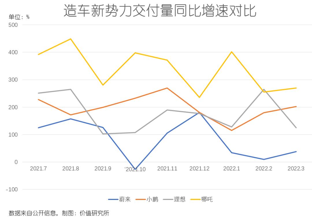 除了和自己比进步明显,横向对比“蔚小理”,哪吒的交付量增长速度也相当惊人。