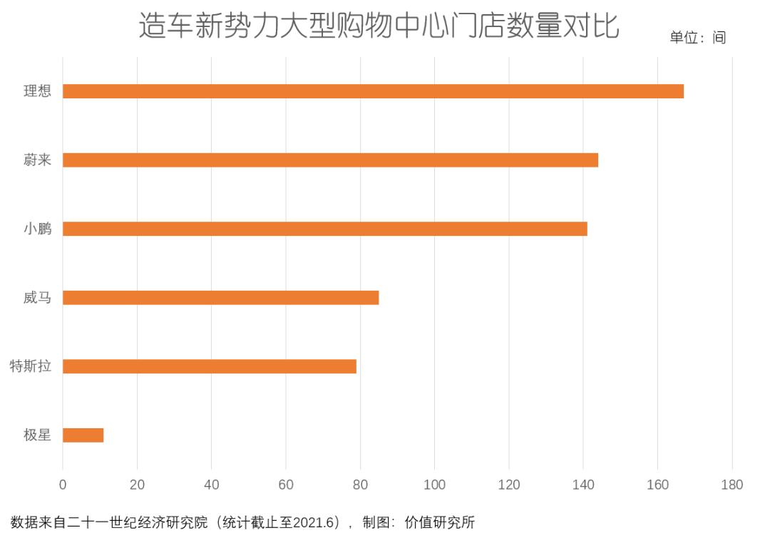 反倒是门店总数最少的理想,在一线大城市、高端购物中心的门店数是最高的。根据二十一世纪经济研究院统计的数据,截止去年上半年,理想在城市大型购物中心共开设了39家门店,不仅高于蔚来、小鹏,也远超特斯拉。