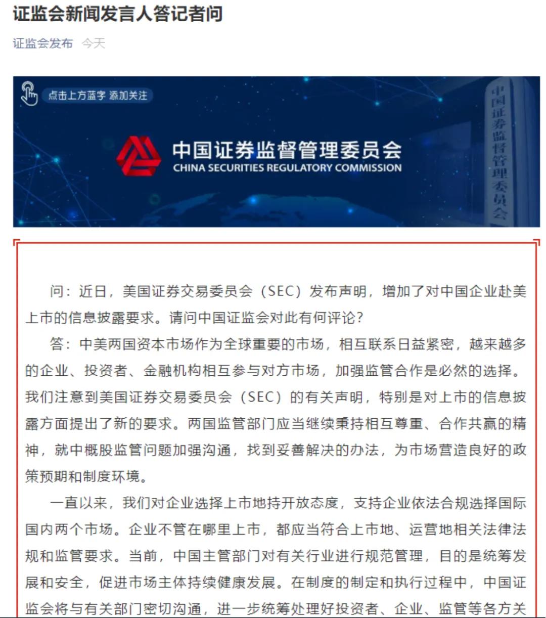 证监会表示,国家扩大资本市场对外开放的方向不会改变,支持企业依法合规到境外上市、用好两种资源的态度不会改变,规范的目的是为了促进发展。