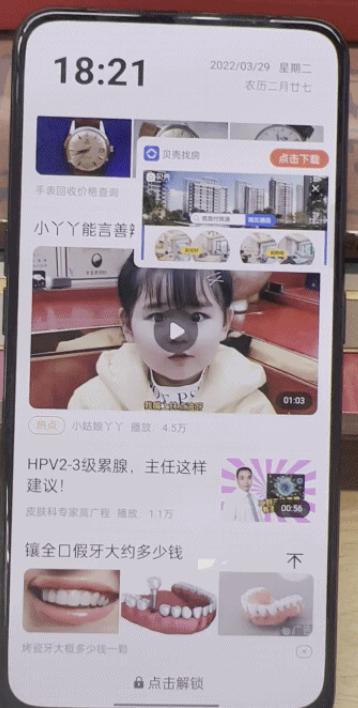 还原一下,大概是这样的:流氓软件在你解锁手机后,立刻弹出一个广告页面给你,但这个广告页面被他们通过增加 “ 时间 ” 跟 “ 上滑解锁 ” 这种要素,让你误以为这是锁屏页。
