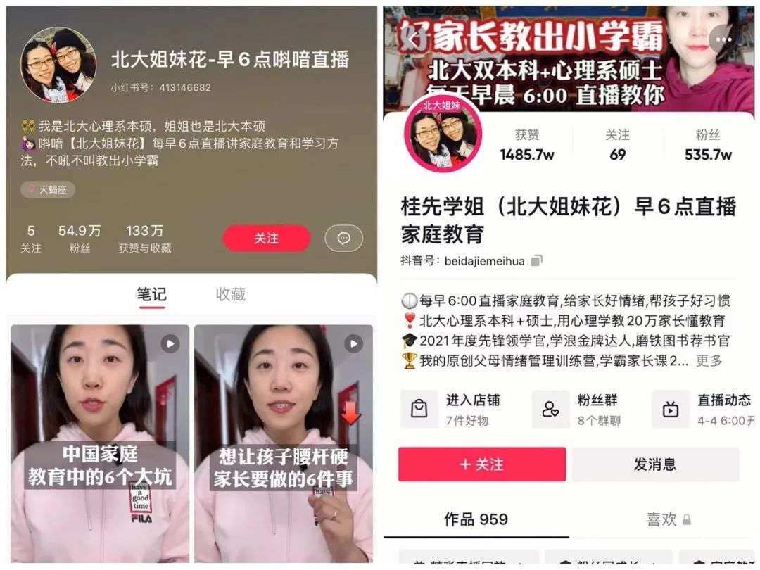 最近在小红书涨粉很快的@北大姐妹花,分享的内容主要是亲子教育、心理学相关知识等,目前已经积累了53.2W的粉丝。在她的昵称后缀上就明晃晃地写着:早6点唞喑直播。