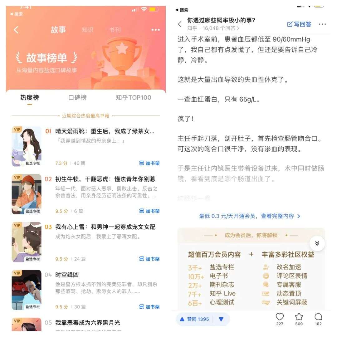 知乎“视频化”的折戟只是定位摇摆的一个表现。除此之外,内容“网文化”也是知乎近年备受诟病的一个战略。根据2021年1月知乎官网统计,以奇闻和言情为主要题材的故事专栏占据了盐选专栏热度TOP100的87%份额,这让知乎成了媒体眼中的“阉割版”起点中文网。