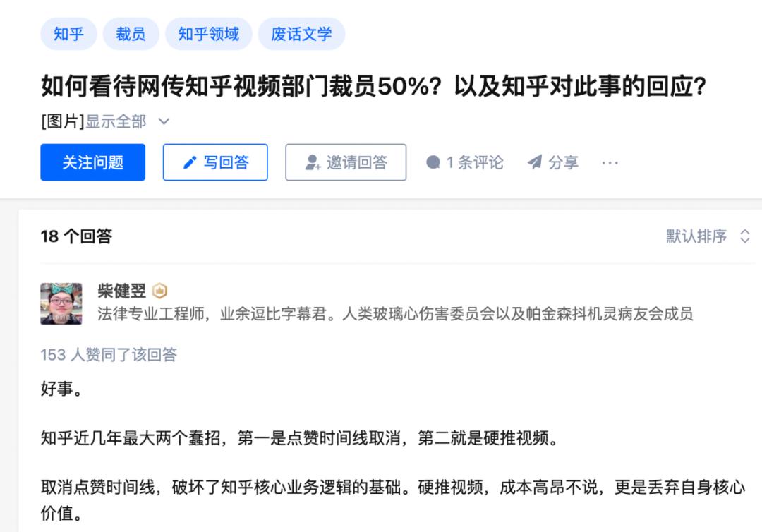 虽然在3月14日财报电话会议上,知乎董事长兼首席执行官周源特意强调:“我们的视频化策略被证明是有效的,它将知乎内容的多样性提升到了一个新的水平。”然而从裁员传闻及产品改版来看,知乎已经开始降低视频的优先级。