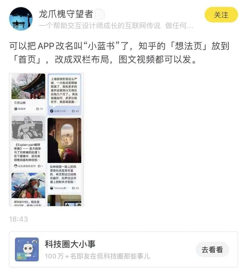 然而,从新版产品形态及知乎的“辟谣”来看,所谓的“战略重构”“二次创业”似乎是老用户的一厢情愿。知乎虽然放弃了类似抖音、快手的视频信息流,却并未放弃视频战略,重回首页的“想法”页面采用了图、文、视频双排信息流模式,以至于有内测用户评论“不看下排的图标还以为是小红书”。