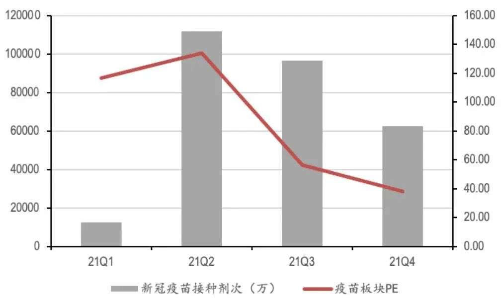 2021年A股疫苗板块市盈率与当季新冠疫苗接种量关系 图片来源:中银证券