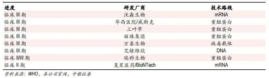 中国部分在研新冠疫苗产品 图片来源:中银证券