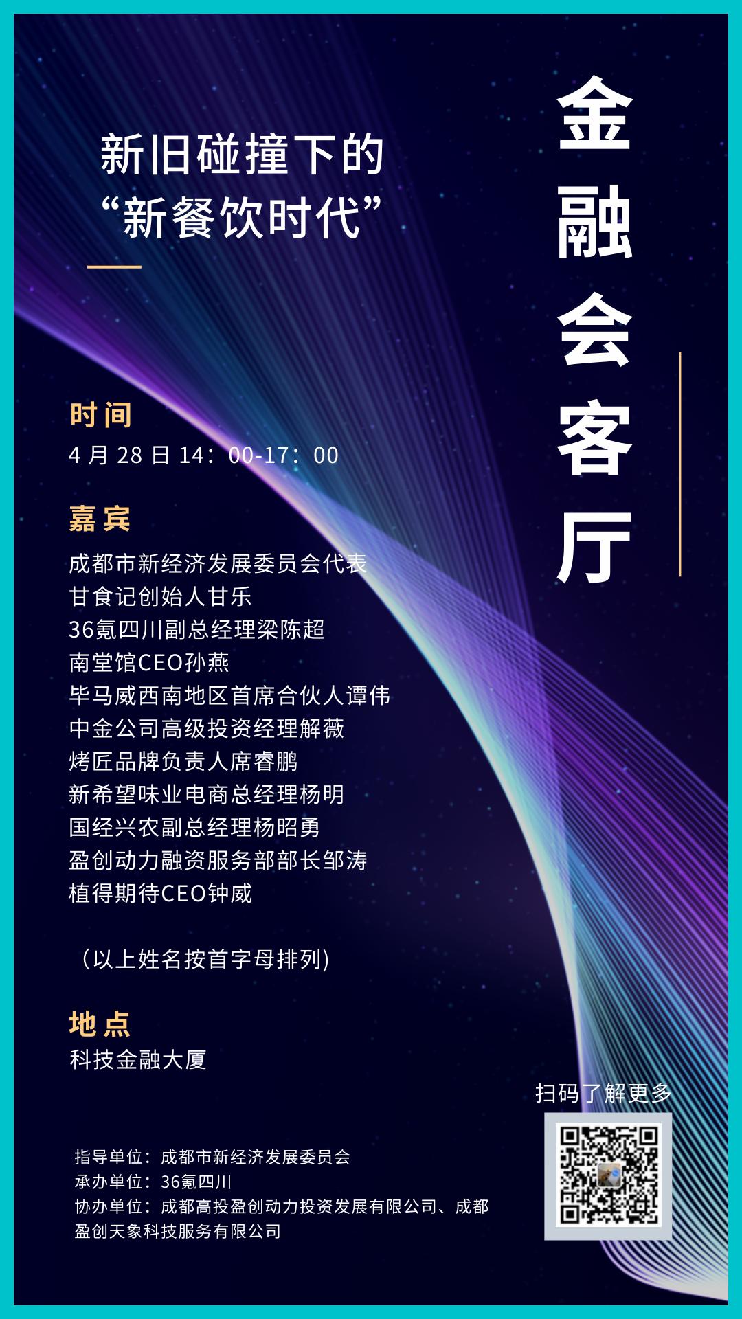 4月28日,由成都市新经济发展委员会指导,36氪四川承办,成都高投盈创动力投资发展有限公司、成都盈创天象科技服务有限公司协办的“金融会客厅”——新旧碰撞下的“新餐饮时代”交流会即将举行。