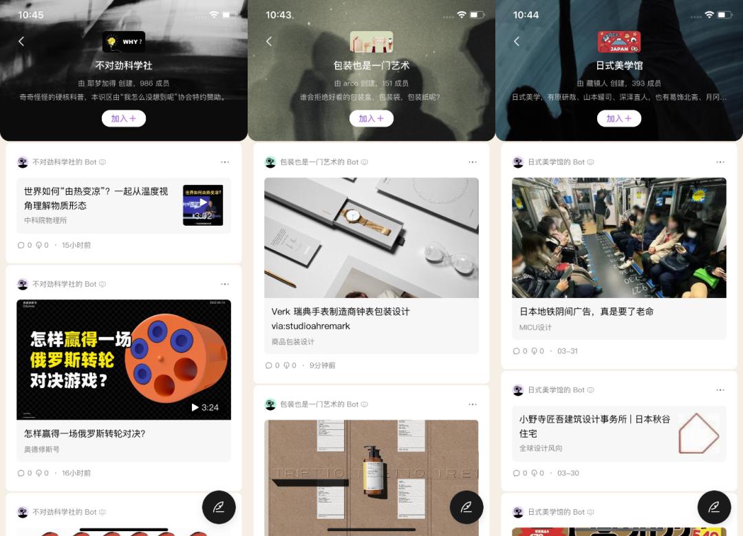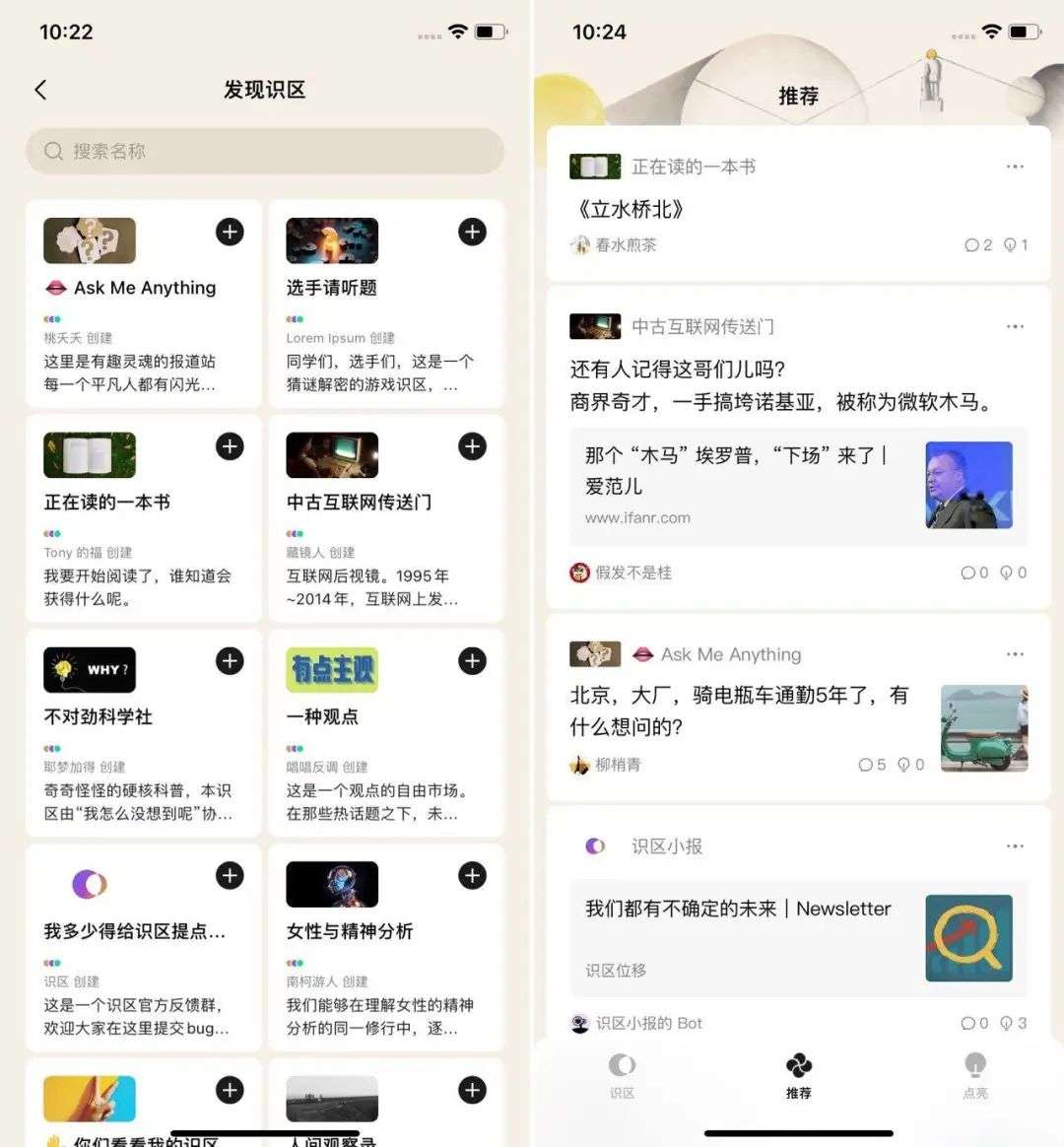 「中古互联网传送门」「流行乐坛观察」「人人都爱谐音梗」「日式美学馆」「影迷的自我修养」……这些识区就像是一个个兴趣圈子。加入成为成员后,你可以在这里阅读和点亮(相当于点赞收藏)内容,留下评论,或发帖分享你的思考和观点。