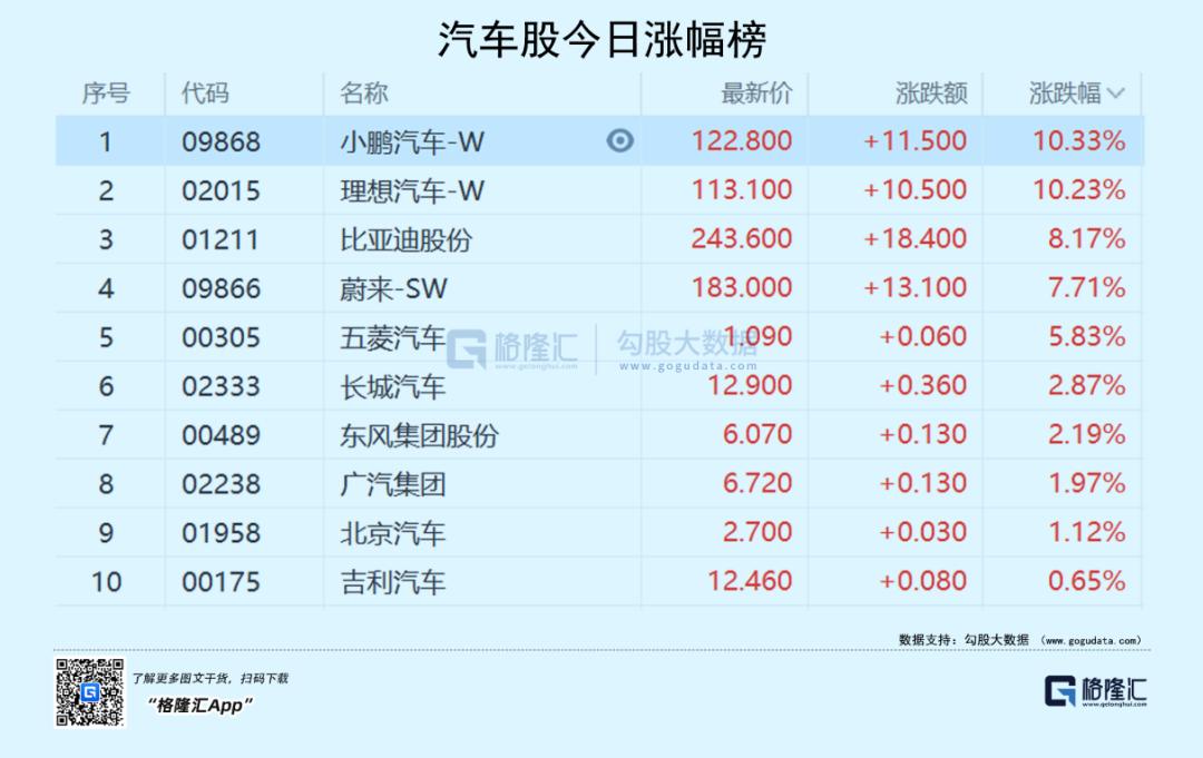 另外,此前一路走低的汽车股近期也有企稳反弹的迹象,反弹最猛的还数造车新势力。理想汽车、小鹏汽车涨超10%,比亚迪涨超8%,蔚来涨超7%,长城汽车、吉利等跟涨。