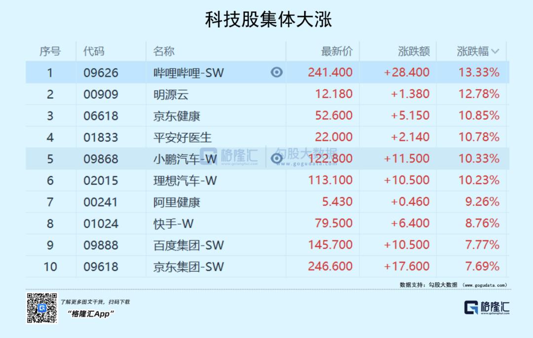 具体来看,科技股集体大涨。哔哩哔哩涨超13%,明源云涨超12%,京东健康、平安好医生、小鹏汽车、理想汽车涨超10%。尤其中概股,表现得更夸张。