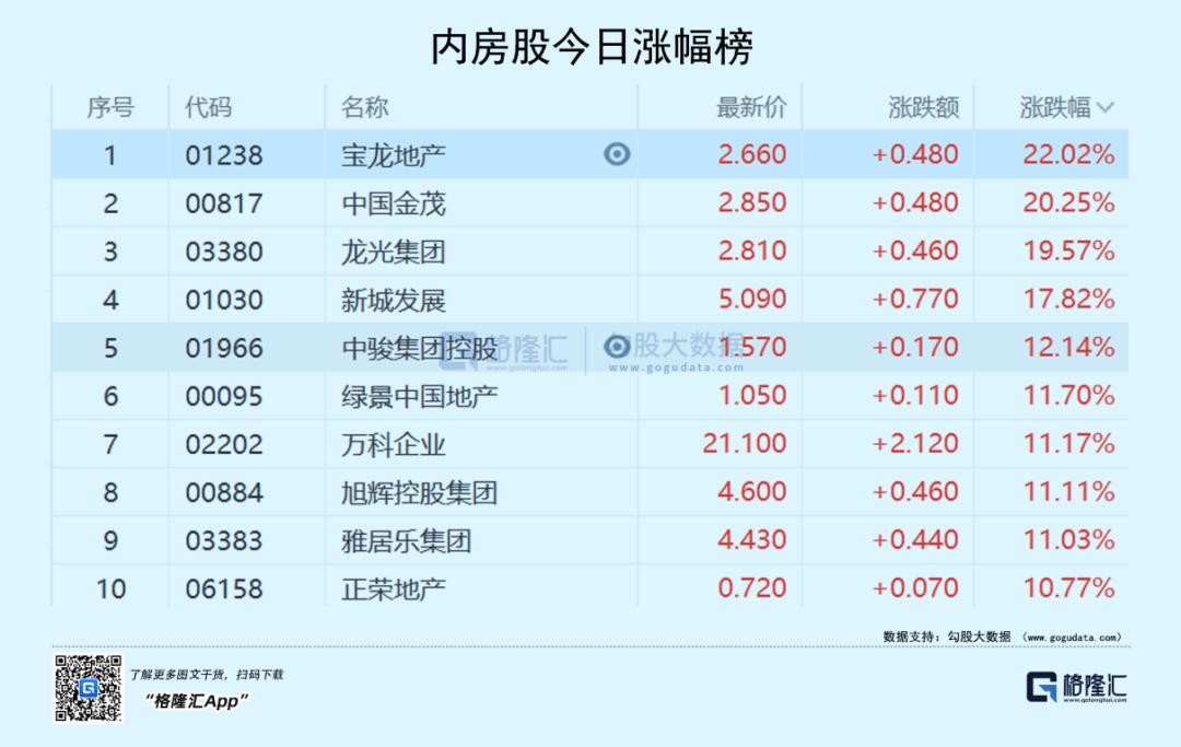 所以今天的地产继续嗨的一笔。宝龙地产涨超22%,中国金茂涨超20%,龙光集团涨超19%,新城发展涨超17%,万科企业、旭辉控股、正荣地产等跟涨。这么一看,不涨10%以上,都挤不上光荣榜...