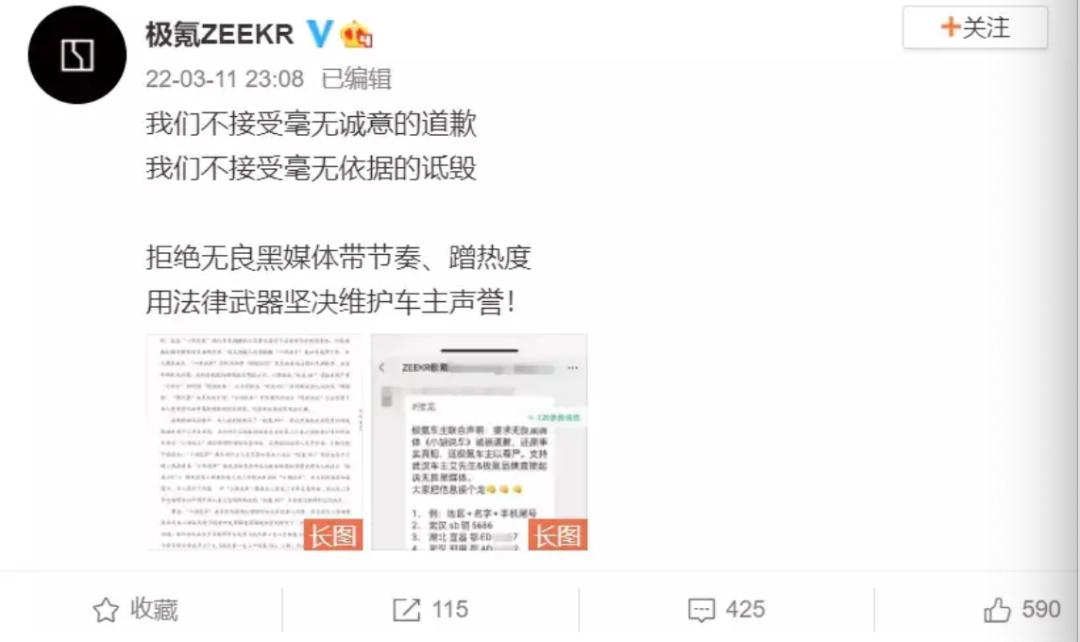 事件发酵之后,极氪汽车投诉“小胡说车”虚假测评,伤害品牌名誉并要求“小胡说车”公开道歉。随后,尽管“小胡说车”发布了道歉视频,但却被网友指出,“这哪是道歉,明明是对极氪表示不满、不服。”极氪汽车方面则表示并不接受道歉,将保留追求责任的权利。