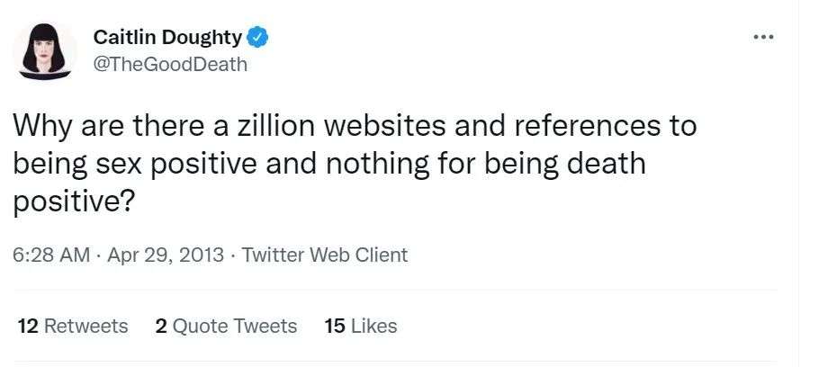 早在2013年,一位名为凯特琳道蒂的殡葬师在推特上发出这种疑问:为什么有无数的网站和资料提及「性积极」,但没有「死亡积极」的参考?