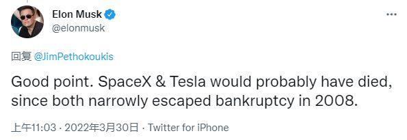 马斯克在推特上对该提案抱怨道:“如果美国政府2008年就开始征税的话,特斯拉和Space X可能已经破产了。”