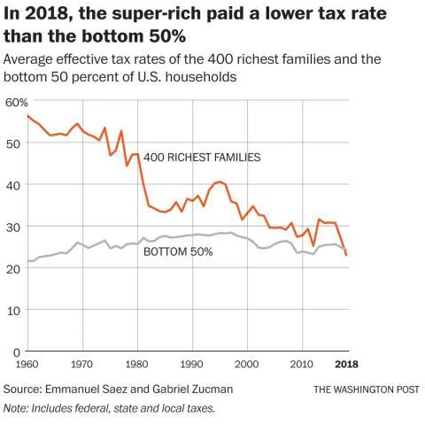 美国最富有的400个家庭与美国底层50%的家庭的平均实际税率变化。图源《华盛顿邮报》