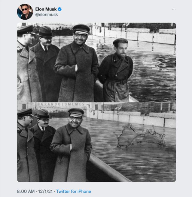 但马斯克似乎对这位印度裔新CEO非常不满意。他在Twitter上公开嘲讽新任CEO,甚至用了斯大林和叶佐夫的历史老照片,P上了阿加瓦尔和多西的头像,暗讽Twitter赶走了多西。