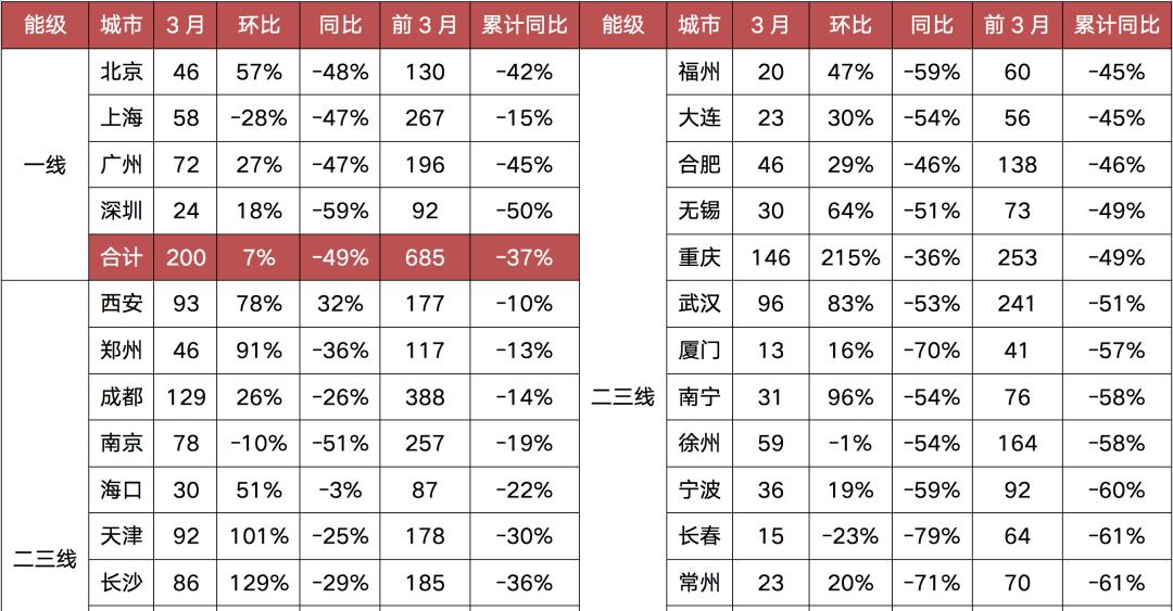 城市间分化持续加剧,西安、郑州、成都和南京一季度累计同比降幅已收窄至20%已下,而武汉、南宁、长春等一季度累计仍同比下降超50%。