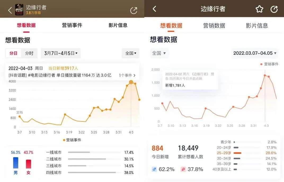 (本轮点映也为《边缘行者》创造了猫、淘想看日新增峰值)