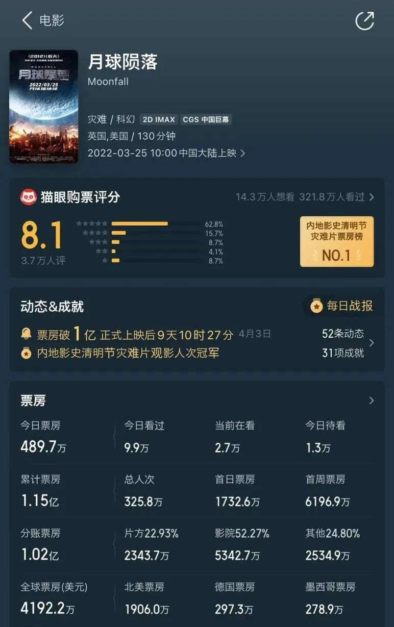 一个典型的表现是。清明档票房亚军是一部上映十余天的好莱坞灾难片《月球陨落》。作为一部非常标准的好莱坞灾难片,《月球陨落》的内容已经可以用陈旧来形容,上映至今全球票房不过4192.2万美元,国内猫、淘评分也仅有8.1和7.9。
