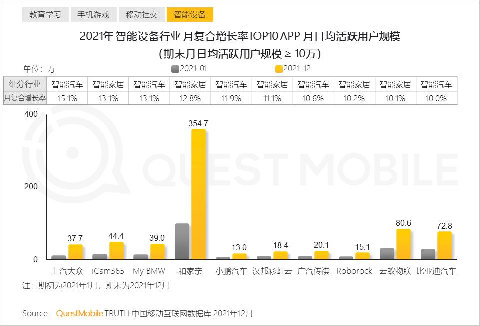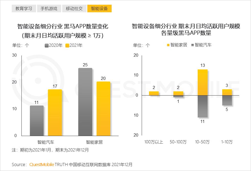 12、2021年智能汽车行业黑马APP增长显著,但智能家居行业量级上更具优势,市场用户基础更广