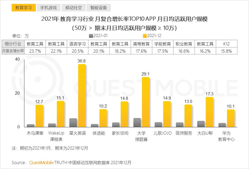 3、在线学习涉及各年龄层学生,对应群体的热门应用也呈现快速增长