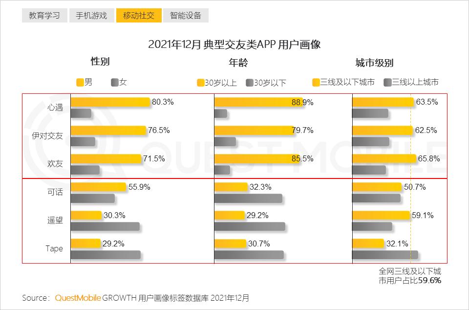9、陌生交友应用市场呈现两极化,纯婚恋交友类以下沉市场的30岁以上男性用户为主;基于兴趣爱好的社区交友应用则以一二线城市年轻女性居多,突出反映了社会现实