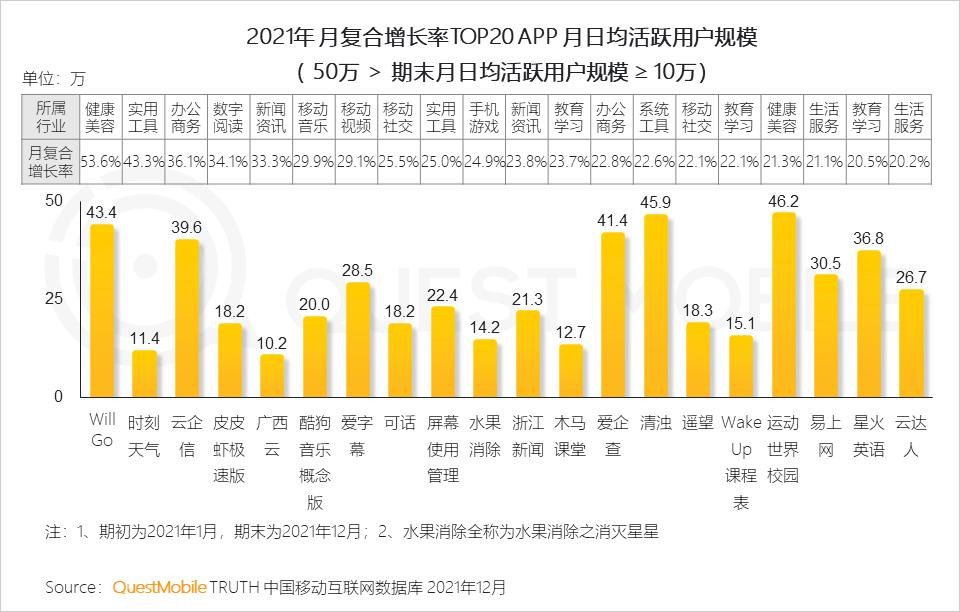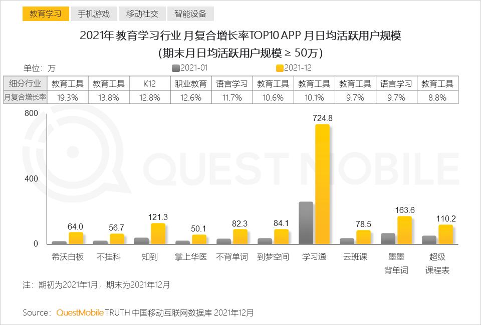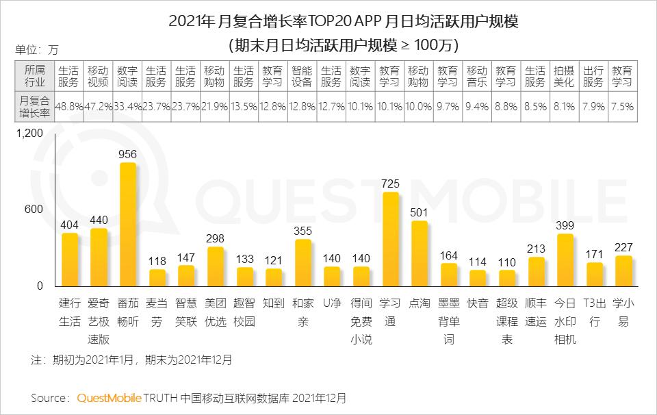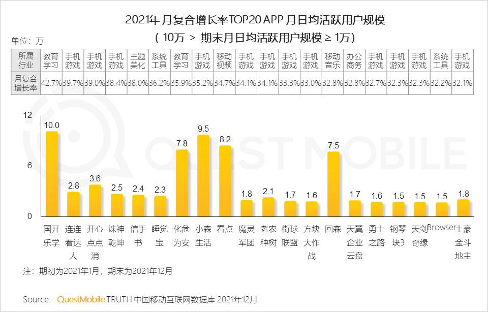 言归正传,今天Mr.QM想要分享的主题是2021年移动互联网黑马报告。QuestMobile数据显示,虽然移动互联网整体用户进入高位盘整,但是2021年仍有一些领域用户保持正向增长,用户规模增长TOP 1000APP(期末月日均活跃用户规模≥1万)中,教育学习(19.2%)、生活服务(13.3%)、手机游戏(10.7%)等领域位居前列。