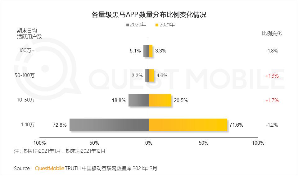 1.3 黑马APP从量级分布上更多向腰部聚集,百万以上量级APP增长趋缓的同时规模小的应用也需要拥有一定用户沉淀才能保持较高增长