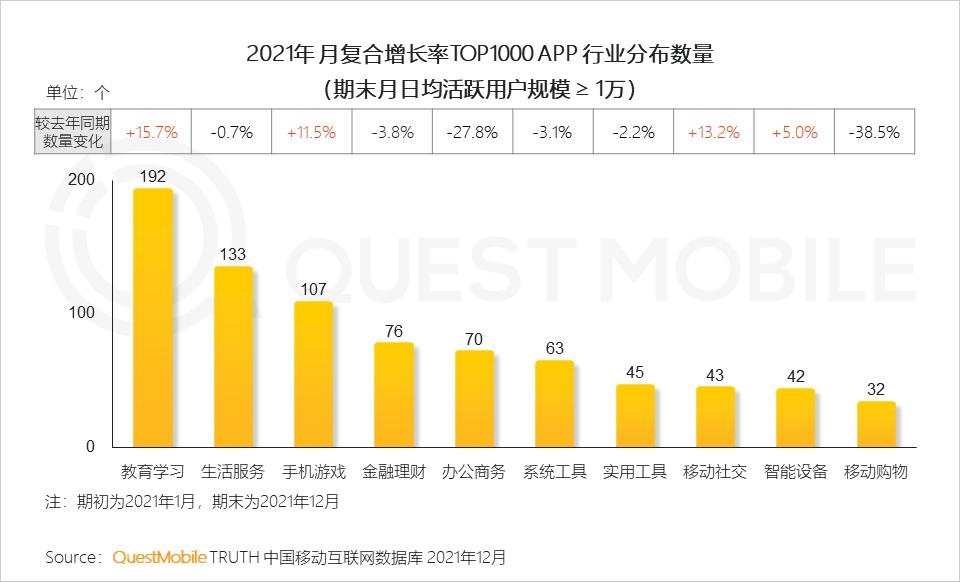 1.1 全面数字化渗透带动移动生活服务模式呈现爆发式增长,2021年用户规模增长最快的TOP1000 APP主要分布在教育、生活服务、游戏行业