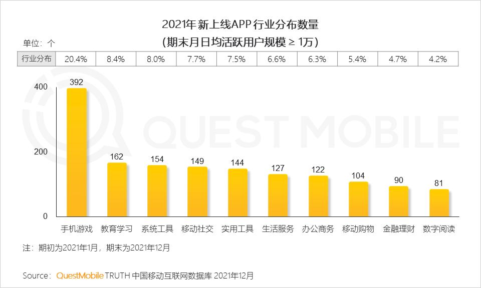 1.4 2021年新上线APP中,手机游戏占据多数比例,其他行业数量分布相对均衡,创业者赛道选择更加谨慎、全面