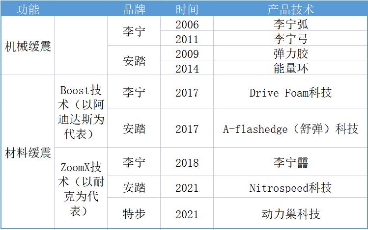 如下图,以材料缓震功能为例,在市面上主导的两大类别中,直到2021年特步才推出动力巢的中底技术。