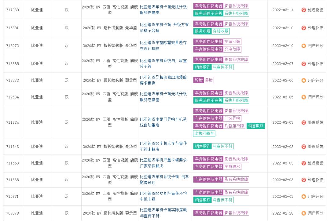从去年国内新能源车型销量表现来看,比亚迪汉为代表的中大型新能源车型各月销量榜中,比亚迪连续数月占据榜首。但就在比亚迪汉狂揽销量的同时,该车型受到的投诉也一直都在持续着。