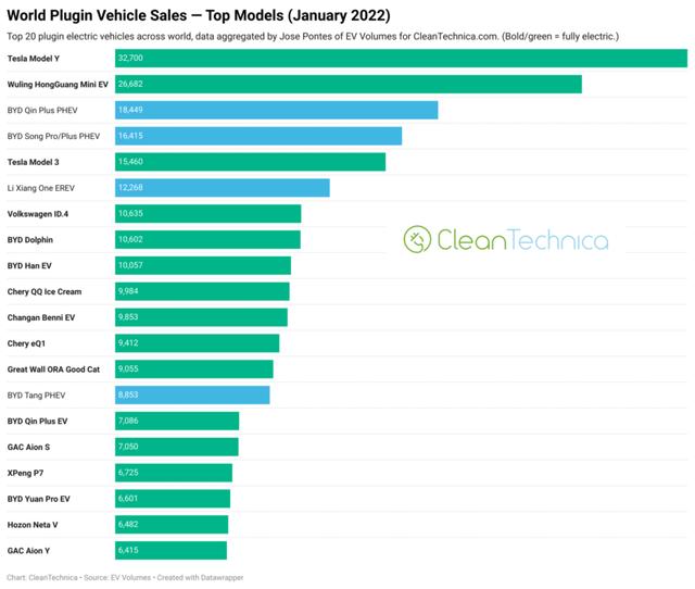 CleanTechnica的数据显示,原本销量长虹的的上汽通用五菱mini EV,今年1月销量同比大幅下降27%,看起来这款小型EV开始受到同类型竞争对手的影响,即奇瑞 QQ 冰淇淋,后者2021年12月28日才上市,但月销量离破万仅一步之遥。