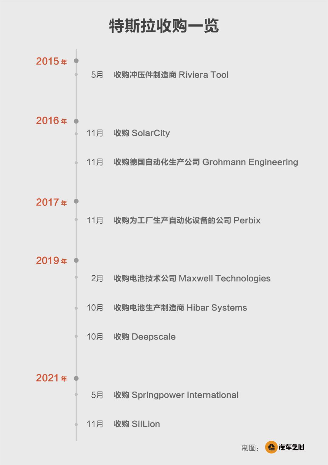 细数下来,特斯拉已经收购了 10 多家公司:从 2015 年的冲压件制造商 Riviera Tool,到 2021 年的电池负极材料技术初创公司 Sillion,以及为获得电池阴极技术收购加拿大公司 Springpower International。